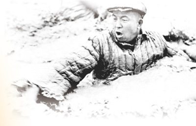 王進(jìn)喜在用身體攪拌泥漿。資料照片