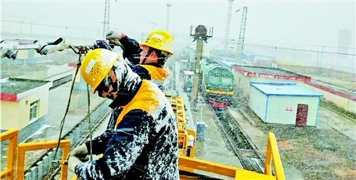 青藏集團公司西寧供電段哈爾蓋接觸網(wǎng)工區(qū)職工冒雪工作。 周賀 攝