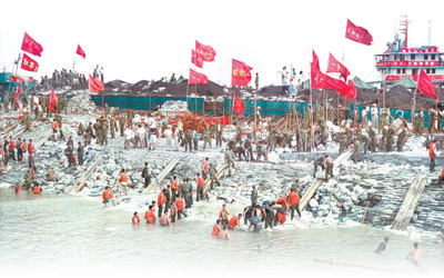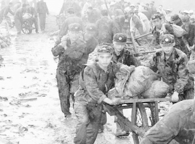 1998年7月,為確保荊江大堤的安全,數(shù)千名解放軍官兵以驚人的毅力堅(jiān)守在大堤上,排除決堤險(xiǎn)情。圖為戰(zhàn)士們運(yùn)送袋裝沙石加固大堤。 新華社記者 李剛 攝