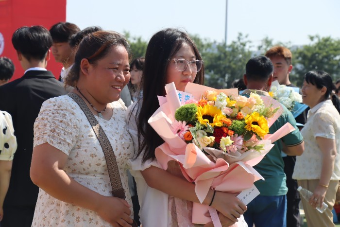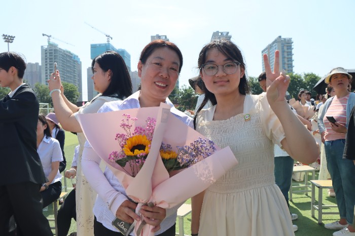 畢業(yè)典禮在開(kāi)場(chǎng)節(jié)目《一起向未來(lái)》中拉開(kāi)了帷幕。高二同學(xué)們用嘹亮的歌聲和熱情洋溢的精彩表演為學(xué)長(zhǎng)學(xué)姐們加油鼓舞,為他們送上最真摯的祝福。 第一項(xiàng),奏國(guó)歌,全體起立,行注目禮。當(dāng)國(guó)歌響起,高三學(xué)子們莊嚴(yán)肅立,在國(guó)歌的見(jiàn)證下,心系家國(guó),立志成才。 第二項(xiàng),杜橋中學(xué)校長(zhǎng)賀啟發(fā)寄語(yǔ)。賀啟發(fā)代表學(xué)校向奮發(fā)有為、長(zhǎng)大成人的高三學(xué)子表示最熱烈的祝賀,同時(shí)對(duì)辛勤付出的家長(zhǎng)與老師表示最衷心的感謝。他期望學(xué)生們能始終不忘學(xué)習(xí),勇于突破,逐夢(mèng)遠(yuǎn)航,心懷“國(guó)之大者”,志存高遠(yuǎn),立志篤行,并祝愿學(xué)生們高考如愿以償,金榜題名,未來(lái)的人生繁花似錦,前程遠(yuǎn)大。 第三項(xiàng),培優(yōu)年級(jí)高三(19)班楊李卓凡家長(zhǎng)發(fā)言。他作為家長(zhǎng)代表向?qū)W校精心育人表達(dá)了由衷感謝,向同學(xué)們步入成年人行列表示祝賀。他希望同學(xué)們用平和的心態(tài)、十二分的信心、百倍的努力、頑強(qiáng)的毅力,不負(fù)青春韶華,為民族復(fù)興偉業(yè)展現(xiàn)青春作為、彰顯青春風(fēng)采、貢獻(xiàn)青春力量。 第四項(xiàng),教師代表馬昱婷老師發(fā)言。馬昱婷代表高三全體教師祝賀同學(xué)們即將成長(zhǎng)為風(fēng)華正茂、勇攀高峰、不懈奮斗的熱血青年,希望同學(xué)們堅(jiān)定信念、勇往直前,以更加成熟的心態(tài)和更加堅(jiān)定的步伐,迎接人生的每一個(gè)挑戰(zhàn)和機(jī)遇,堅(jiān)定不移地追求遠(yuǎn)大理想,書(shū)寫(xiě)無(wú)悔青春。 第五項(xiàng),高三學(xué)生代表?xiàng)罾钭糠舶l(fā)言。楊李卓凡回顧了自己高中三年的成長(zhǎng)歷程,感謝有同學(xué)朋友的安慰、父母的用心陪伴、老師的悉心開(kāi)導(dǎo),使她走出了高三緊張、焦慮和忐忑的情緒困境。她祝愿同學(xué)們?cè)诟呖贾薪鸢耦}名,用青春譜寫(xiě)人生新的篇章,做自己人生的主角,做最好的自己! 第六項(xiàng),家長(zhǎng)給學(xué)生佩戴畢業(yè)紀(jì)念章,班主任代表學(xué)校給學(xué)生贈(zèng)送《憲法》,學(xué)生代表給科任老師獻(xiàn)花。