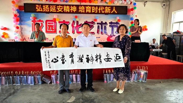 華陰市延安精神研究會會員、華陰市美術家協會主席孟潮先生現場揮毫潑墨,為學校贈送了“延安精神潤育童心”“傳承延安精神 培育時代新人”等書法作品。