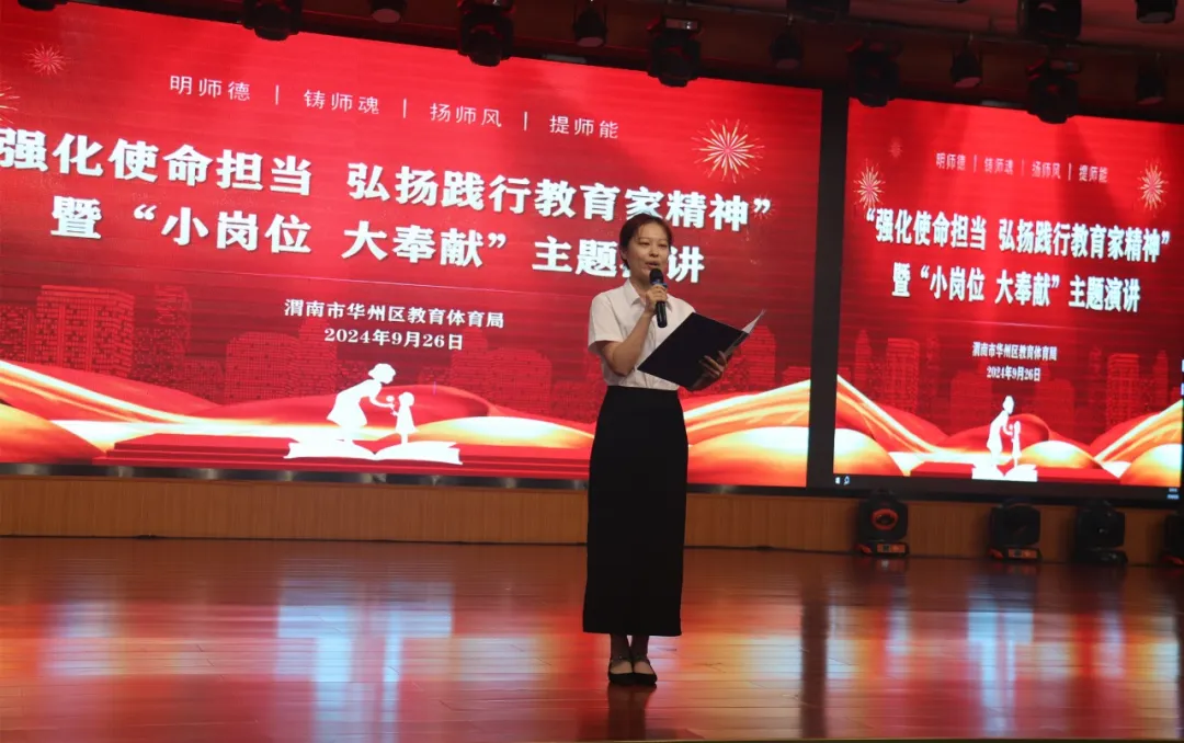 渭南市華州區(qū)教體局舉行“強(qiáng)化使命擔(dān)當(dāng) 弘揚(yáng)踐行教育家精神”暨“小崗位 大奉獻(xiàn)”主題演講比賽文化藝術(shù)網(wǎng)-文化藝術(shù)報(bào)訊(全媒體記者 高盼成)9月26日,渭南市華州區(qū)教體局在毓秀小學(xué)舉行“強(qiáng)化使命擔(dān)當(dāng)、弘揚(yáng)踐行教育家精神”暨“小崗位、大奉獻(xiàn)”主題演講比賽。來(lái)自全系統(tǒng)的31位教師依次登臺(tái),展開(kāi)激烈角逐。