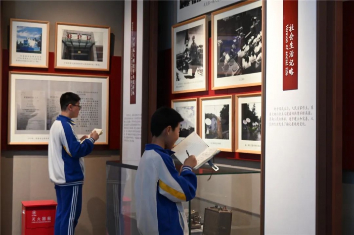 在懷舊風(fēng)、年代感滿滿的“百年滄!闭桂^內(nèi),容納了渭南社會百年的歷史變遷,展示百年渭南的 重大 事件、重要的發(fā)展與實踐。那陳列了百年間渭南民生的變遷之物和一段段鮮活的奮斗故事如同打開月光寶盒一樣時光倒流,以“實景化”的形式帶領(lǐng)同學(xué)們走進那時的生活場景和奮斗歷程。 “這個仰韶文化彩陶盆我們歷史書上也有!”同學(xué)們驚呼,課本中的知識“活”起來了。