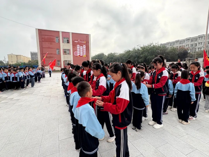 隨后,少先隊(duì)員代表為新隊(duì)員佩戴紅領(lǐng)巾。當(dāng)鮮艷的紅領(lǐng)巾在新隊(duì)員胸前飄揚(yáng),標(biāo)志著他們正式加入少先隊(duì)組織,成為“星星火炬”下的新一員。