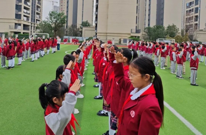儀式現(xiàn)場(chǎng),莊嚴(yán)雄壯的出旗曲奏響,旗手邁著鏗鏘有力的步伐,高舉五星紅旗與中國(guó)少年先鋒隊(duì)大隊(duì)旗入場(chǎng)。紅旗飄揚(yáng)間,盡顯信仰方向;隊(duì)歌嘹亮中,滿(mǎn)含少年擔(dān)當(dāng)。在場(chǎng)少先隊(duì)員整齊行隊(duì)禮,新隊(duì)員滿(mǎn)懷向往行注目禮,全體人員齊唱《中國(guó)少年先鋒隊(duì)隊(duì)歌》,清脆又堅(jiān)定的歌聲,傳遞出新時(shí)代少年的蓬勃朝氣與責(zé)任擔(dān)當(dāng)。