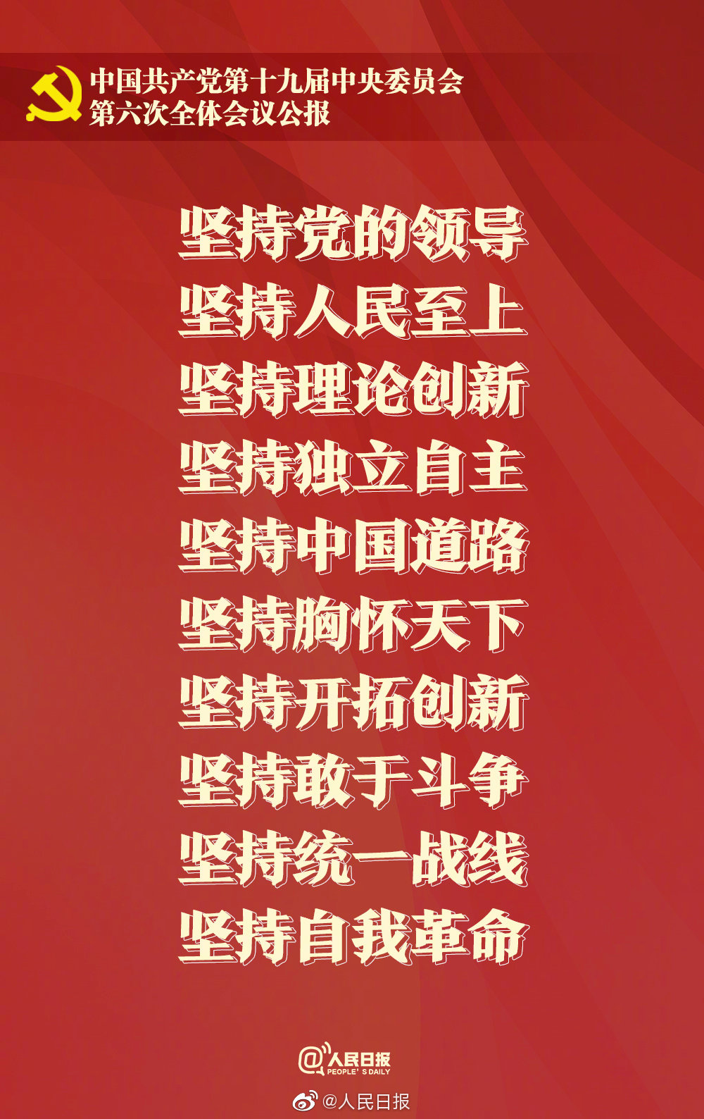 十九屆六中全會(huì)公報(bào):百年奮斗教會(huì)我們十個(gè)堅(jiān)持@人民日?qǐng)?bào) 11月11日消息,十九屆六中全會(huì)提出,一百年來(lái),黨領(lǐng)導(dǎo)人民進(jìn)行偉大奮斗,積累了寶貴的歷史經(jīng)驗(yàn),這就是:堅(jiān)持黨的領(lǐng)導(dǎo),堅(jiān)持人民至上,堅(jiān)持理論創(chuàng)新,堅(jiān)持獨(dú)立自主,堅(jiān)持中國(guó)道路,堅(jiān)持胸懷天下,堅(jiān)持開拓創(chuàng)新,堅(jiān)持敢于斗爭(zhēng),堅(jiān)持統(tǒng)一戰(zhàn)線,堅(jiān)持自我革命。