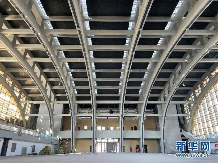 東沙文體館項目的大跨度清水混凝土拱形桁架梁施工效果。新華網(wǎng) 楊喜龍 攝