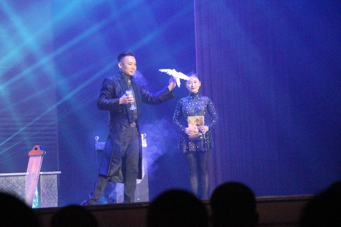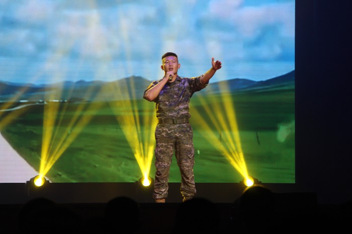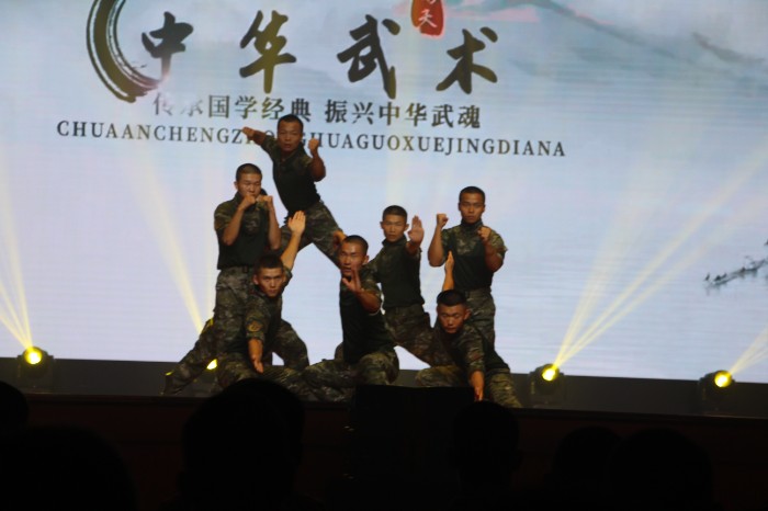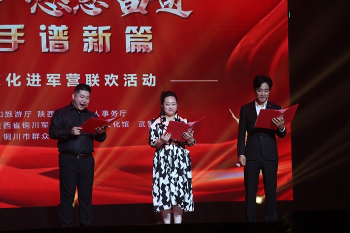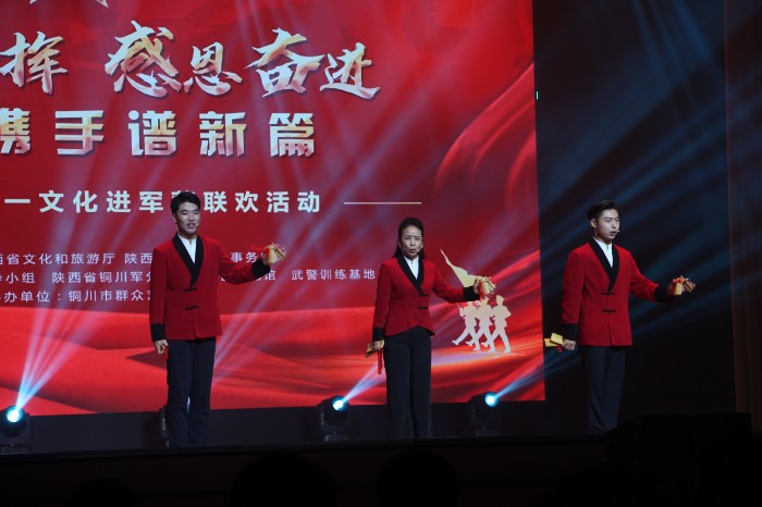 下午3時,演出劇場早已座無虛席。整臺演出在群星獎入圍獎舞蹈《歡慶秧歌》中啟幕。之后深情脈脈的歌曲《故鄉(xiāng)》,技若神功的雜技《太空漫步》,清耳悅心的古箏與行云流水的書法《山丹丹開花紅艷艷》美輪美奐;阿卡貝拉小合唱《我愛你中國》《中國軍魂》唱出了鐵血男兒的深情,表達了他們?yōu)t灑無畏、報效祖國的堅定決心;特別是榮獲中國戲劇梅花獎、國家文華獎、國務院中國文化事業(yè)突出貢獻獎,現(xiàn)任陜西省文學藝術界聯(lián)合會副主席、陜西省戲劇家協(xié)會主席劉遠的朗誦《一百零二年又是奇跡的開始》使現(xiàn)場觀眾流連忘返;神奇而精彩的魔術《鴿劇魅影》深深吸引了現(xiàn)場觀眾;旋律悠揚的笛子獨奏《我是一個兵》令人心潮澎湃;快板《長征》歌頌了黨的長征精神和舉世矚目的輝煌成就,書寫了波瀾壯闊的歷史畫卷,留下了彌足珍貴的寶貴經驗和精神財富;婉轉悠揚的歌曲《和你的默契》,精彩絕倫的《武術表演》,聲情并茂激動人心的朗誦《清澈的愛,只為中國》,酣暢淋漓的舞蹈《行鼓行》等精彩的節(jié)目輪番上演;顒釉诟枨对僖淮纬霭l(fā)》和現(xiàn)場官兵們熱烈互動的掌聲中謝幕。