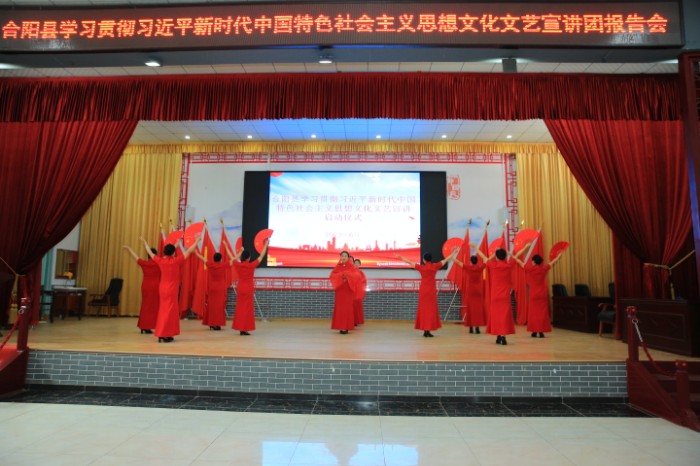 儀式上,合陽縣文聯(lián)主席劉均鋒為群眾解讀習近平新時代中國特色社會主義思想主要精神,將黨的新思想、新理論、新政策及時傳遞給群眾。合陽縣委宣傳部理論組組長同樺樺作的主題宣講《長征精神》為大家?guī)砹艘粓鲋黝}鮮明、內涵豐富的黨課。隨后,快板《魅力合陽縣》、舞臺劇《鄉(xiāng)村振興正當時》、旗袍秀《五星紅旗》等精彩節(jié)目輪番上演,不時將宣講推向高潮……演員奮力表演,觀眾熱情高漲,讓黨的創(chuàng)新理論伴隨著這一個個有溫度、接地氣的文藝節(jié)目深入人心。