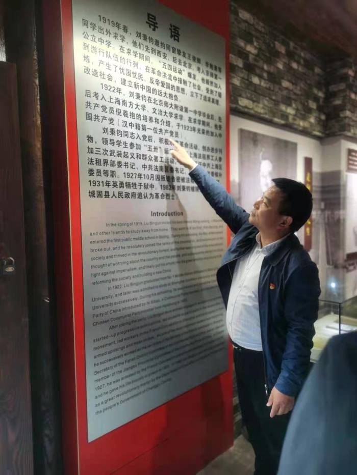 在劉秉鈞革命烈士故居。全體黨員聆聽革命先烈的英雄事跡,從一件件飽含故事的物件中,感受革命先烈的豪情壯志,既是追尋英雄精神,也是紅色基因的傳承力量。隨后,面對鮮紅的黨旗,全體黨員高舉右拳,重溫入黨誓詞。堅(jiān)定黨的初心和使命。