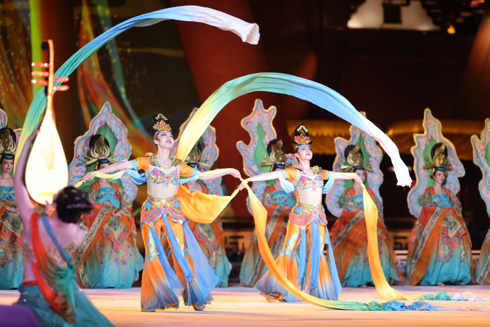 5月18日,演員在中國(guó)-中亞峰會(huì)文藝演出中表演。新華社記者 劉彬 攝 豪放的秦腔《夢(mèng)回長(zhǎng)安》與高亢的陜北民歌《天下黃河九十九道彎》交相呼應(yīng)、余韻綿長(zhǎng),盡顯古都西安開放和諧、進(jìn)取奮發(fā)的文化神韻。 為青山綠水而歌,載欣載奔舞動(dòng)蓬勃朝氣—— 伴著《春天》婉轉(zhuǎn)悠揚(yáng)的節(jié)奏,一群豆蔻年華的姑娘舞步靈動(dòng)、笑意盈盈,紅綢綠扇飛旋出昂揚(yáng)向上的精氣神。大屏幕上,“秦嶺四寶”朱鹮、大熊貓、金絲猴、羚牛次第展現(xiàn),鳥獸蟲魚恣意棲息,人與自然和諧共生。